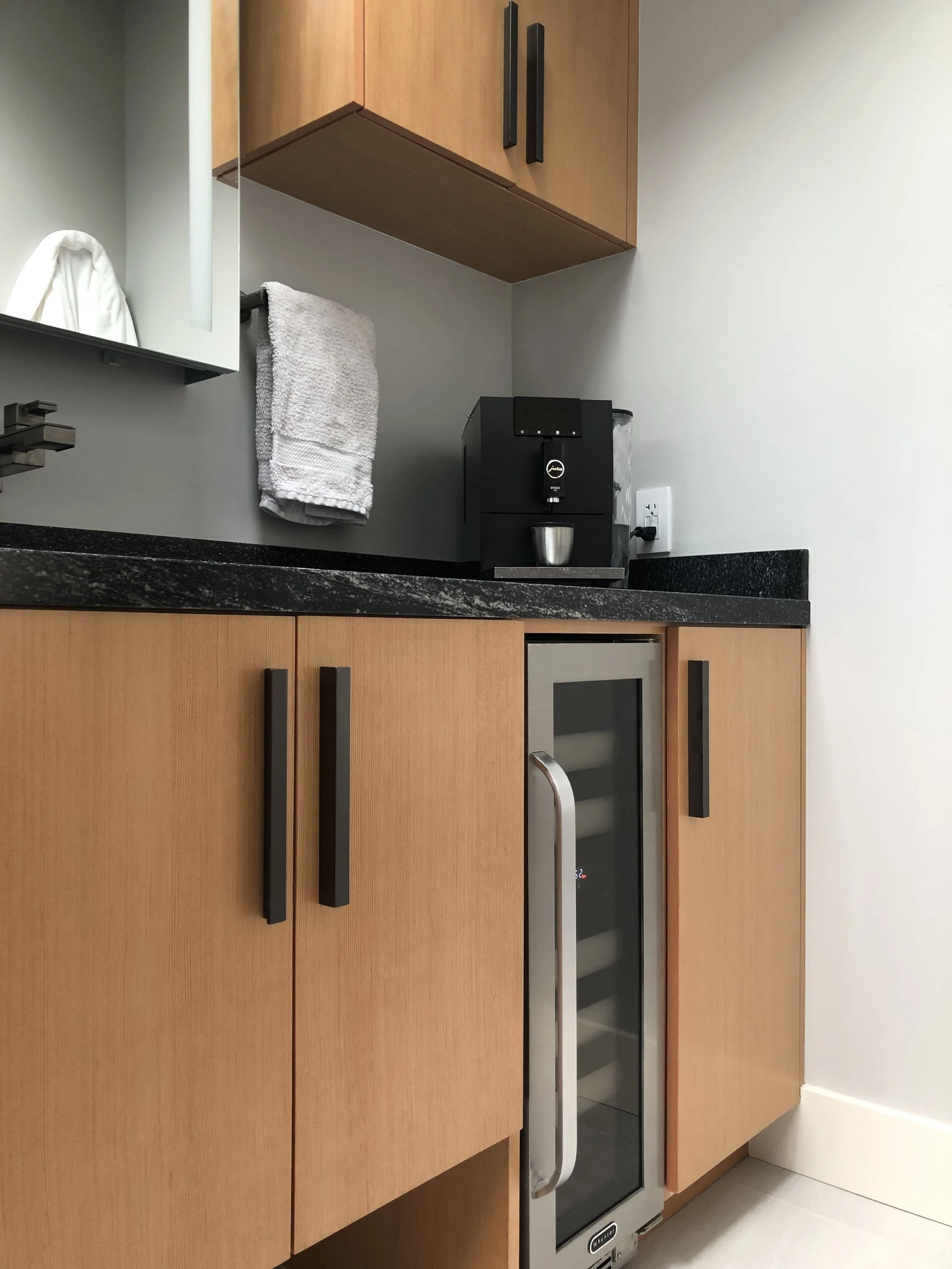 A mini coffee bar with cooler built into the primary bath to give the homeowners a private sanctuary in their own space.