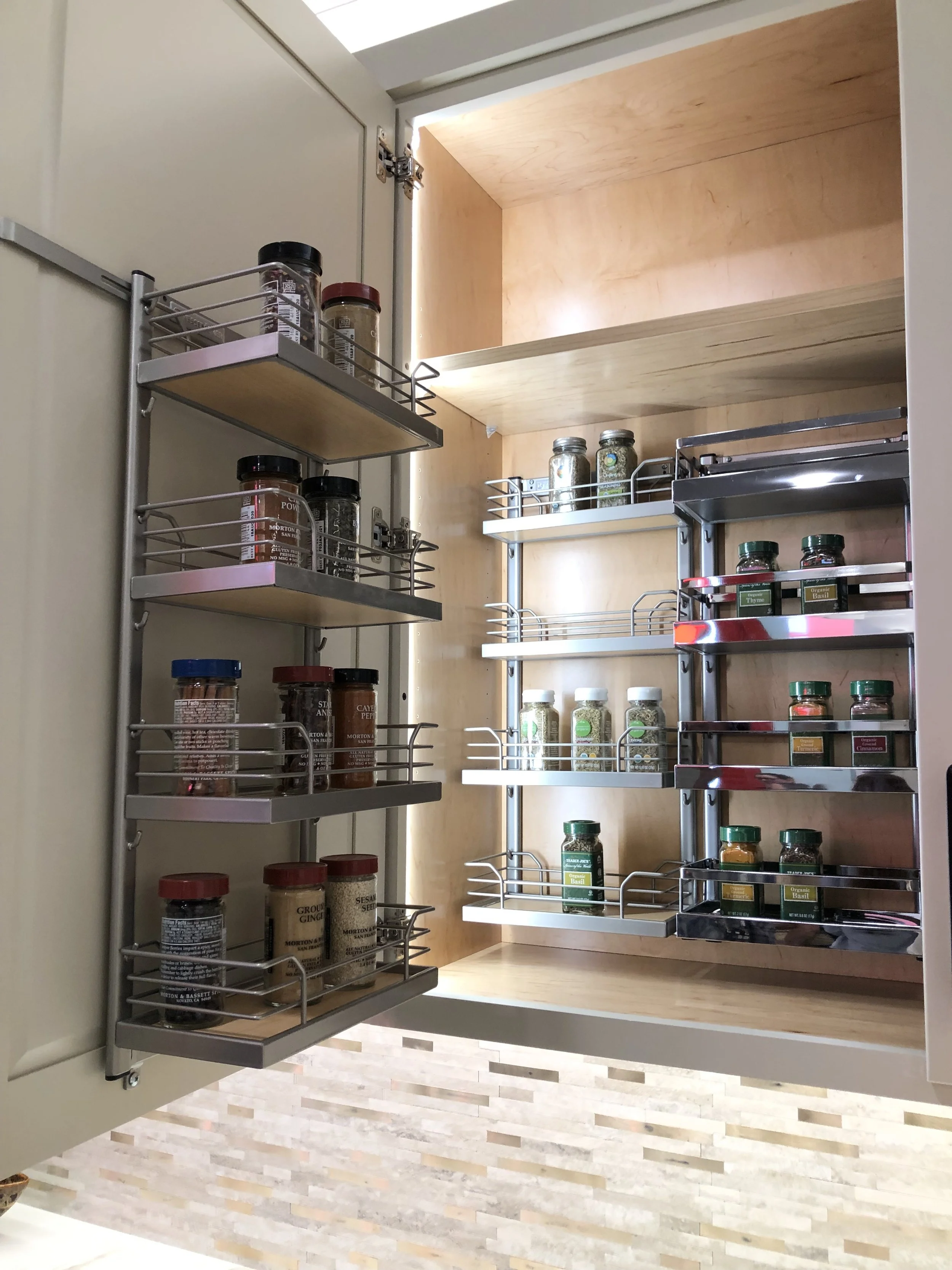 I am a big fan of spice pull outs (we actually have two of them in our kitchen) because they not only make use of the smallest spaces (as narrow as 6”!), but they can (depending on their width) store more than just spices - we store tin foil, saran wrap, extra soap and dishwasher detergent in our 2nd one! If you’re not a fan of the pull outs on the side of the range, sometimes you can store them under your cooktop!