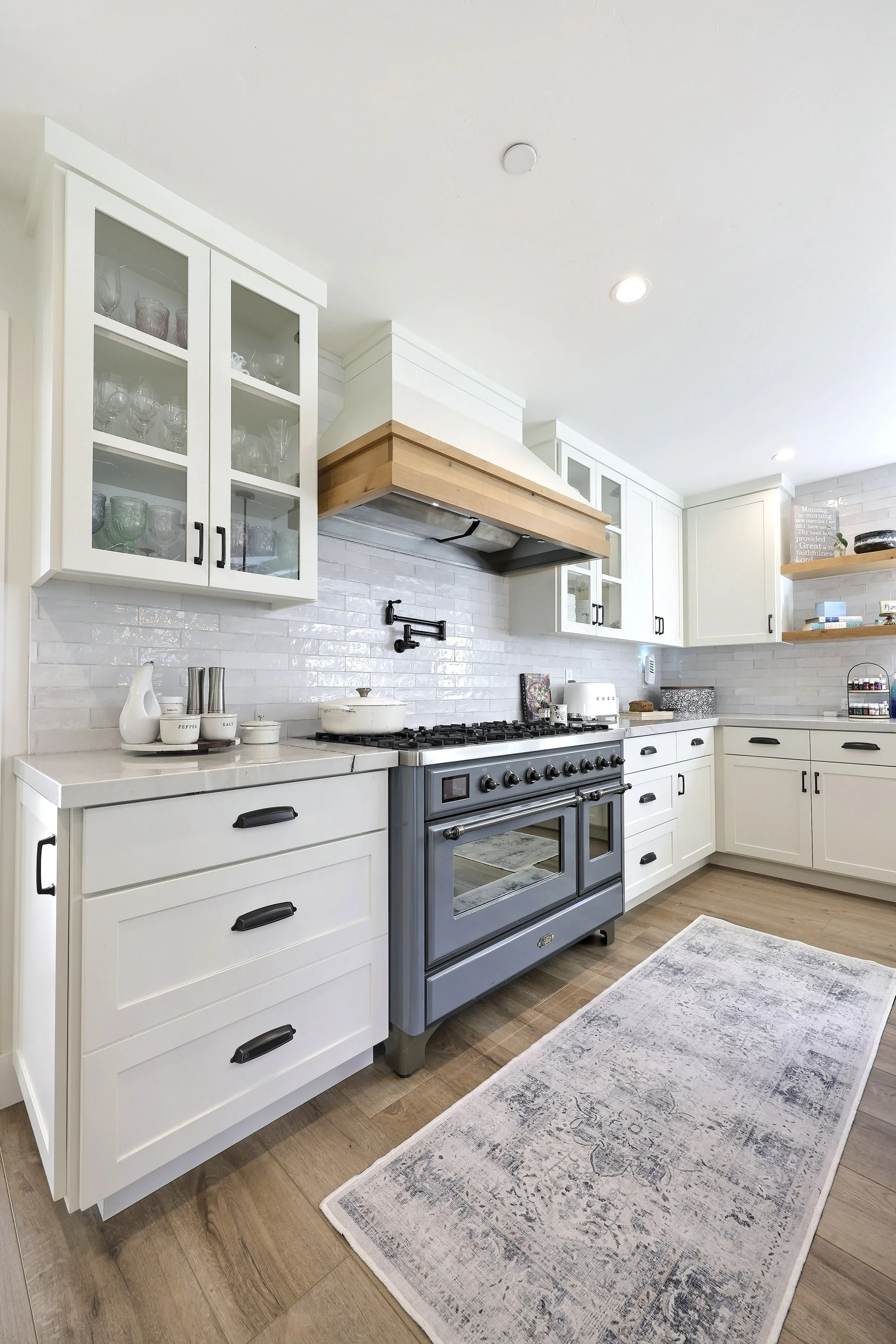 A full view of the beautiful ILVE range, cabinet hood, glass front upper cabinets, and the full height glossy subway tile throughout the kitchen.