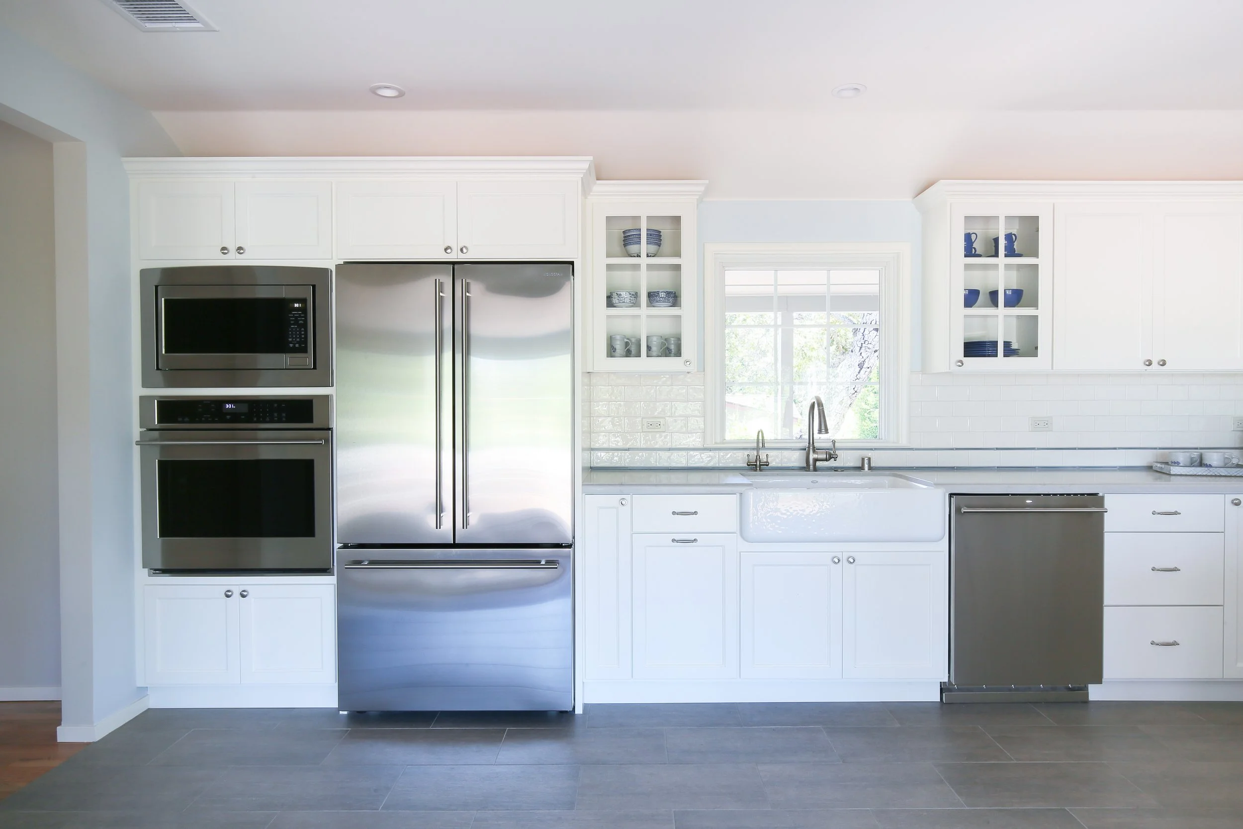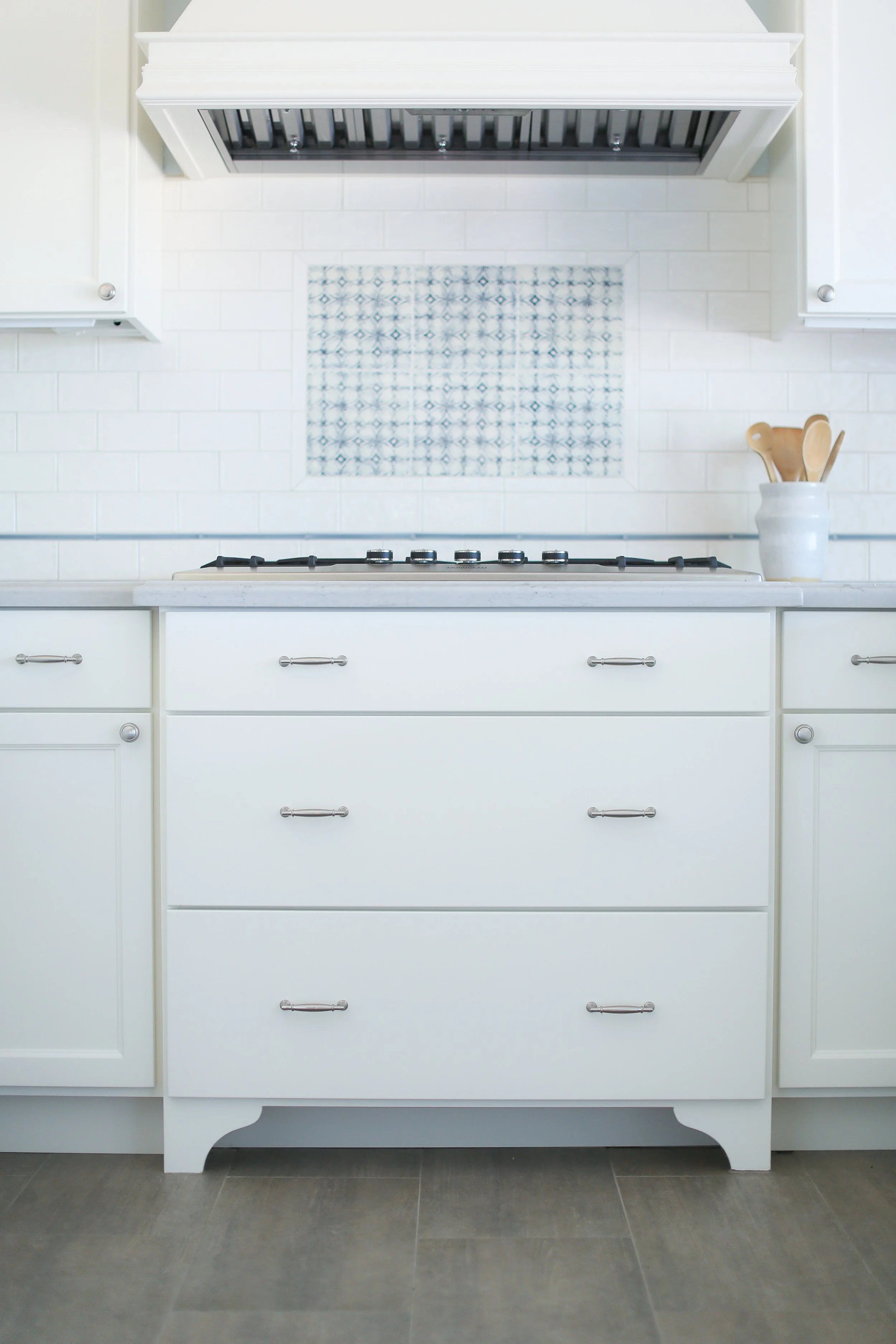 Project Details: This home was originally designed by the Architect William Wurster, built in 1940 and it was important to the homeowners to maintain the architectural integrity of the home. We actually moved the kitchen location completely (it was originally located in the loggia area that has the brick floor in a small ‘U’ configuration that could only fit 1 person at a time!) and designed an open kitchen with beautifully simple details like the ogee countertop edge, the apron front sink, painted white shaker cabinets with a inner bead molding and slab drawer fronts, a glossy white subway tile, with blue pencil liner accents and a hand painted feature tile by Pratt and Larson above the cooktop. The cabinetry is custom built and the hood was a custom design to create a focal point, but not overcrowd the space. The brick in the loggia was originally an exterior patio that had been enclosed and covered up for years, and we had each brick removed, cleaned, and a new foundation wall installed on the exterior wall (since there wasn’t one there!), then each brick was reinstalled. New windows were installed to create an indoor-outdoor feel between the kitchen and the rest of the home, which was a classic element in William Wurster homes of this era.